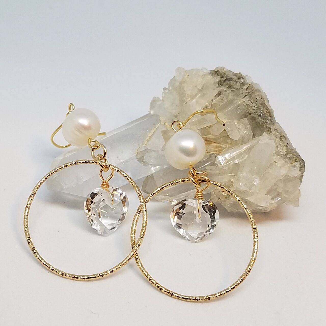 存在感のあるサークルの中で、ブラジル産5Aランクのハートシェイプのカット水晶が光を反射し、耳元できらめく輝きを演出します。